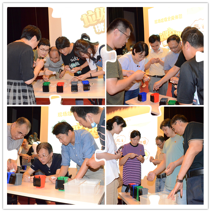 最后以支部为单位开展沉浸式垃圾分类体验活动。每个支部党员面前都有四个垃圾桶、一套垃圾分类操作卡片,需要把所有垃圾分类到对应的垃圾桶。活动现场热闹非凡,伴随着《垃圾分类歌》歌声,党员们认真讨论、交流,合力把一件件“垃圾”投放到不同颜色的垃圾桶内,活动组织者在每个垃圾桶随机抽取一件“垃圾”,检验其正确度。体验活动充分调动了参与学习的积极性,达到寓教于乐的效果。