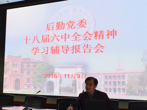 11月9日下午,后勤党委在天赐庄校区图书馆五楼学术报告厅举行“十八届六中全会”专题学习辅导报告会,马克思主义学院院长田芝健教授为我处全体党员和职工作辅导报告。报告会由后勤党委书记黄志斌主持。