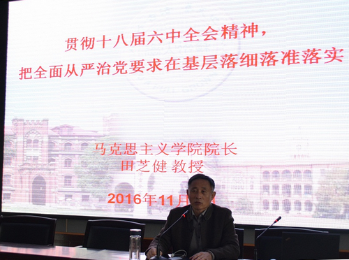 田芝健教授的报告以“贯彻十八届六中全会精神,把全面从严治党要求在基层落细落准落实”为题,以“全面从严治党”为切入点从全面从严治党的内涵、坚决维护党中央权威、党和人民关系、民主集中制、加强党内监督等十六个层面对十八届六中全会的主要精神进行了全方位解读。同时,田教授结合自身多年的探索和研究,对基层党组织建设的目标提出了自己的看法。后勤广大党员通过学习进一步领会了十八届六中全会精神,纷纷表示要时刻牢记党员身份,将全面从严治党的要求落实到具体工作中,做到落细落准落实,推进后勤工作更好发展。
