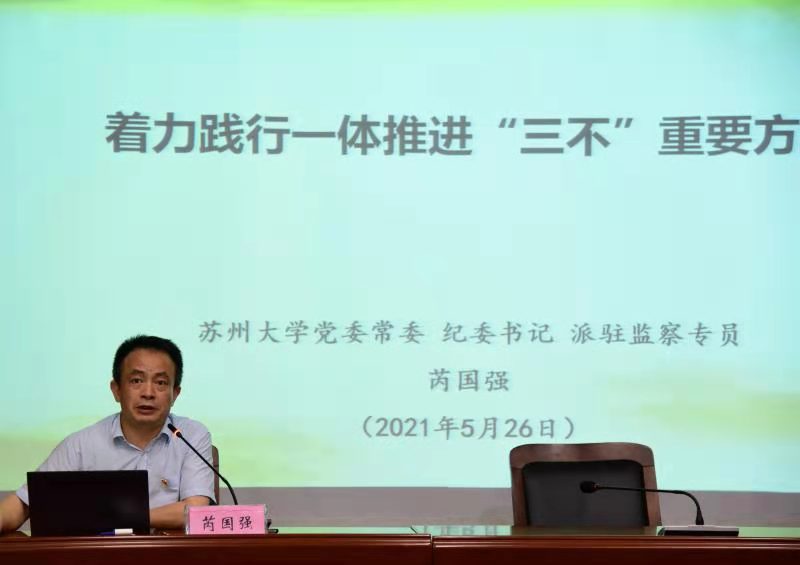 芮国强书记以《着力践行一体推进“三不”重要方略》为题做了专题报告。报告回顾了“三不一体”提出和推进的历史过程。他指出,一体推进不敢腐、不能腐、不想腐,是以习近平同志为核心的党中央在全面从严治党生动实践中总结形成的规律性认识,是把反腐和监督工作融入管党治党全局、嵌入国家治理体系的战略设计,不仅是反腐斗争的基本方针,也是新时代全面从严治党的重要方略。他强调,“一体推进”的重点在于“推进”,必须科学谋划、统筹安排,强化系统集成,在贯通协同上下功夫;不敢腐、不能腐、不想腐是相互依存、相互促进的有机整体,必须统筹联动,增强总体效果。