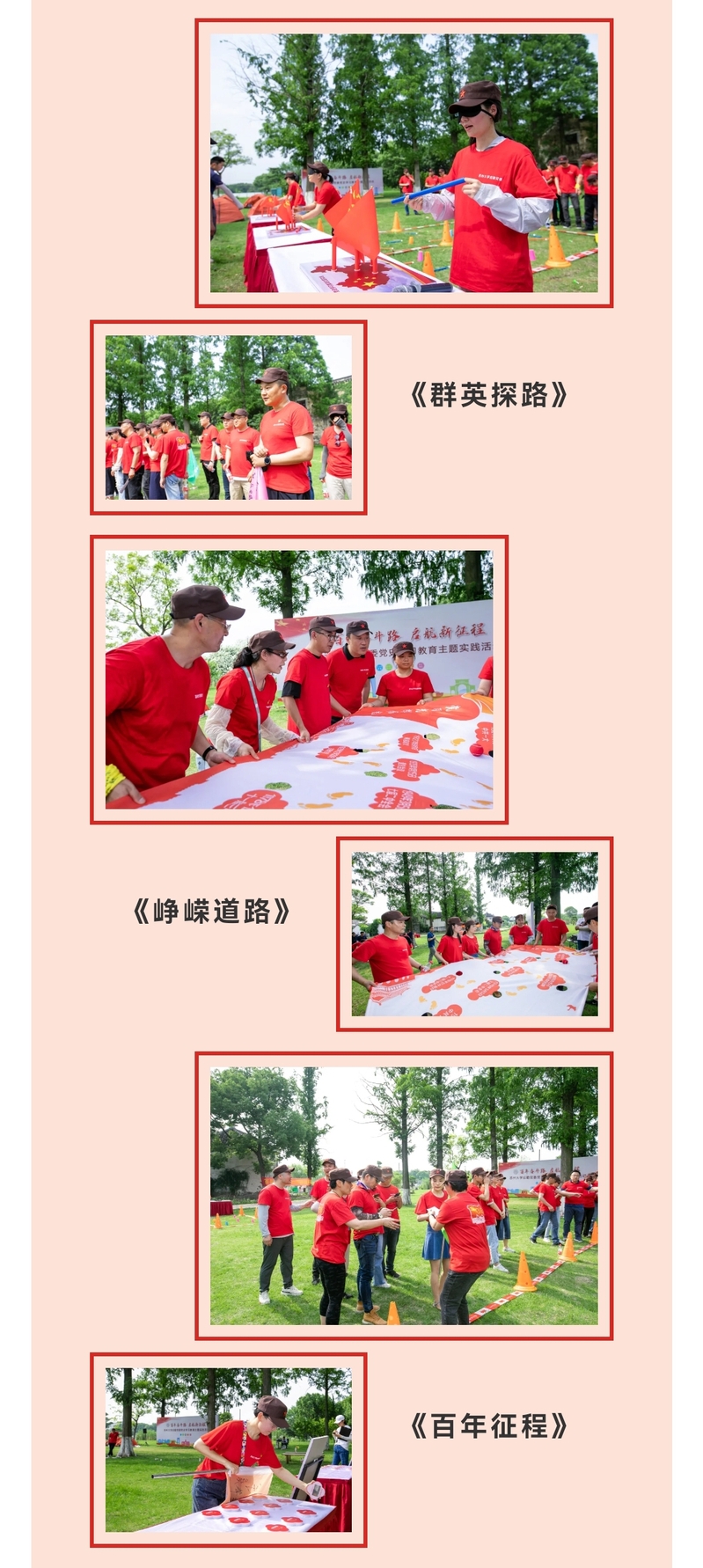 结合党的一百年光辉历程,6个团队根据党在不同时期的发展分别进行了《群英探路》《峥嵘道路》《百年征程》3个项目的体验挑战,通过挑战活动重温了我党百年历史,传承红色基因,奋斗新的征程。挑战过程中以团队沟通和集体协作为重点,团队成员共同研究、分工协作,各显身手、团结拼搏,完成了一个个挑战,从中感受到团队合作的力量,体验到攻克难关时的喜悦。